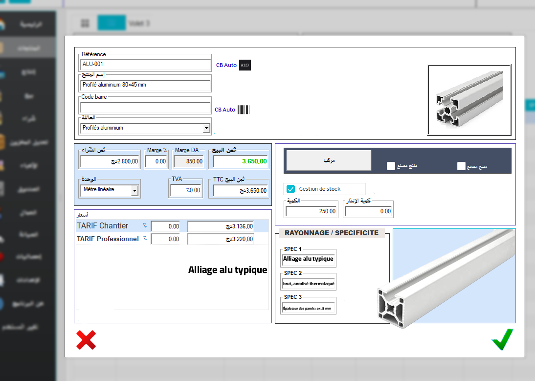 أقوى ميزة في دوليسوفت هي خاصية الحساب التلقائي للمساحة. يكفي إدخال الطول(Longueur) والعرض(Largeur) لأي منتج مثل باب، نافذة، خزانة أو ستار، وسيحسب البرنامج مباشرة المساحة(Surface)، ويطبق السعر بالمتر المربع(M2) ويعطيك المبلغ الإجمالي في ثواني فقط، سواء في عرض سعر(Devis)، أمر شراء(Commande)، سند تسليم(Bon de livraison) أو عملية بيع مباشرة(Vente au comptoir).