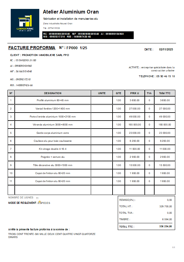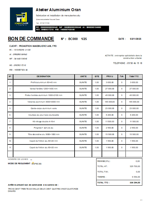 - حساب تلقائي للخصومات، الضريبة على القيمة المضافة، والطابع الجبائي.(TVA et Timbre2025)
