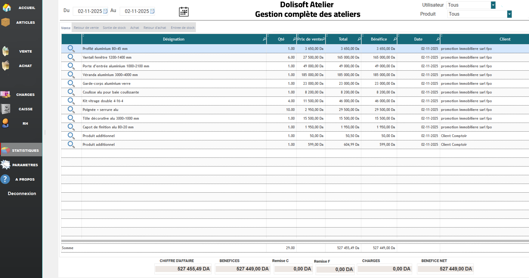دوليسوفت هو برنامج احترافي مصمم خصيصًا لتسيير الورشات الحديثة(Ateliers). سواء كنت تدير ورشة ألمنيوم، نجارة أو خياطة، يساعدك البرنامج على تنظيم، حساب، وتسيير جميع عملياتك اليومية بواجهة بسيطة، سريعة واحترافية 100%.