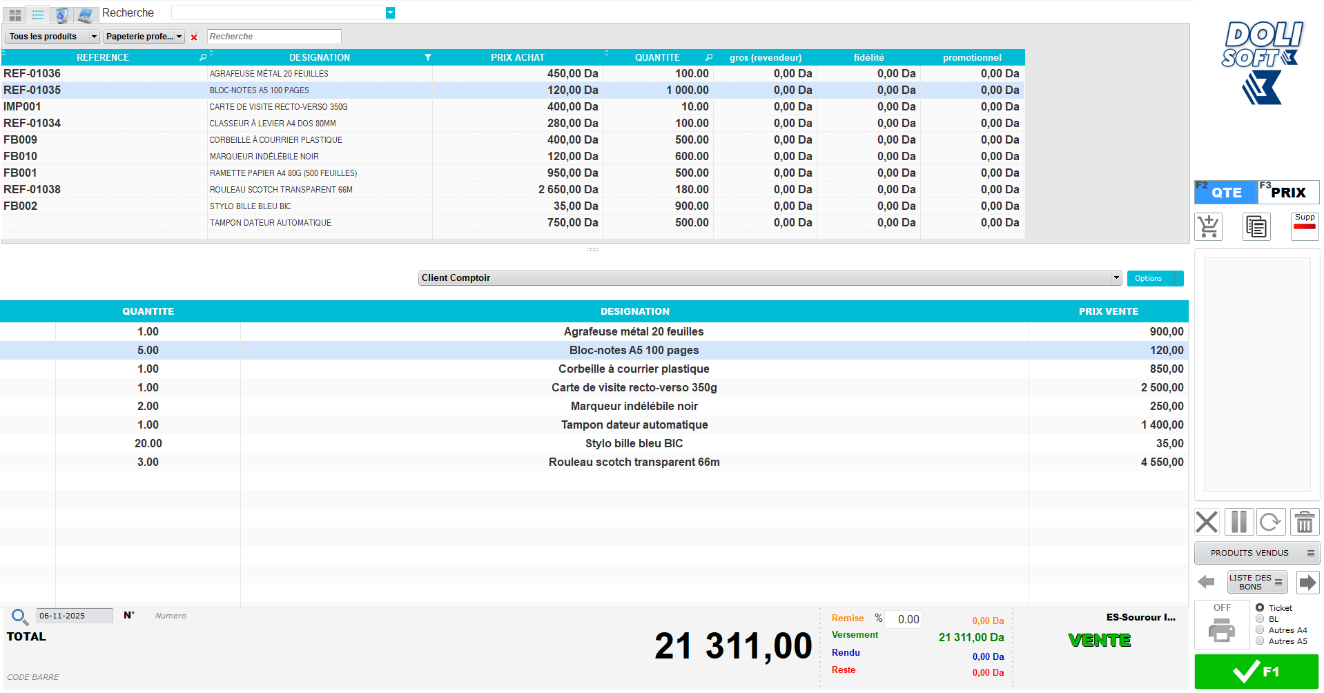 دوليسوفت هو برنامج تسيير متكامل وحديث صُمم خصيصاً لتلبية احتياجات المكتبات والمطابع التجارية. يساعدك على إدارة المنتجات، المبيعات، الزبائن، الموردين، والمخزون بكل سهولة ودقة، ويمنحك تحكماً كاملاً في كل تفاصيل عملك اليومي من خلال واجهة بسيطة وسريعة.